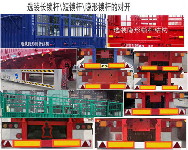 | 备注 | 车厢底板至仓栅顶部高度及对应总高度为:2400mm(4000mm),2200mm(3800mm),2000mm(3600mm),1800mm(3400mm),选装长锁杠或短锁杠或隐形锁杠的对开门仓栅结构,可选装两层,三层仓栅,后部选装花栏式后门,三开扇式后门,对开式半封闭后门,对开全封闭样式,后门厢板可为横瓦楞,竖瓦楞,镀锌板,铝合金板,方管平板,方管十字花平板后门;整车货厢栏板选装横瓦楞,竖瓦楞,镀锌板,铝合金板,方管平板,方管十字花样式,侧面厢板可选装四开扇,五开扇,六开扇,七开扇,立柱可选内插,外插样式,选装后部结构,选装号牌板样式,选装大梁异形孔样式,选装后组合灯/雾灯为圆形结构,选装空气悬架,一,ABS:型号:CM2XL-4S/2M;生产厂家:广州瑞立科密汽车电子股份有限公司.二,防护:侧/后防护材料采用Q235,连接方式:侧下部防护装置和后下部防护装置均采用焊接连接,后防离地高度为480mm,断面为140mmX55mm,车长/轴距/后悬/牵引销至车辆最前端的距离尺寸对应关系(mm):13000/6880+1310+1310/2300/1200,13000/6780+1310+1310/2300/1300,13000/6680+1310+1310/2300/1400,12500/6480+1310+1310/2100/1300,12000/6280+1310+1310/2000/1100 | ||