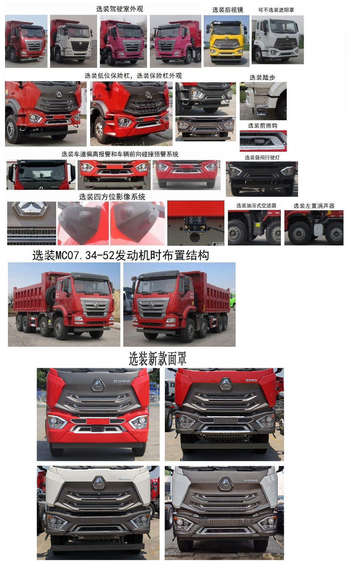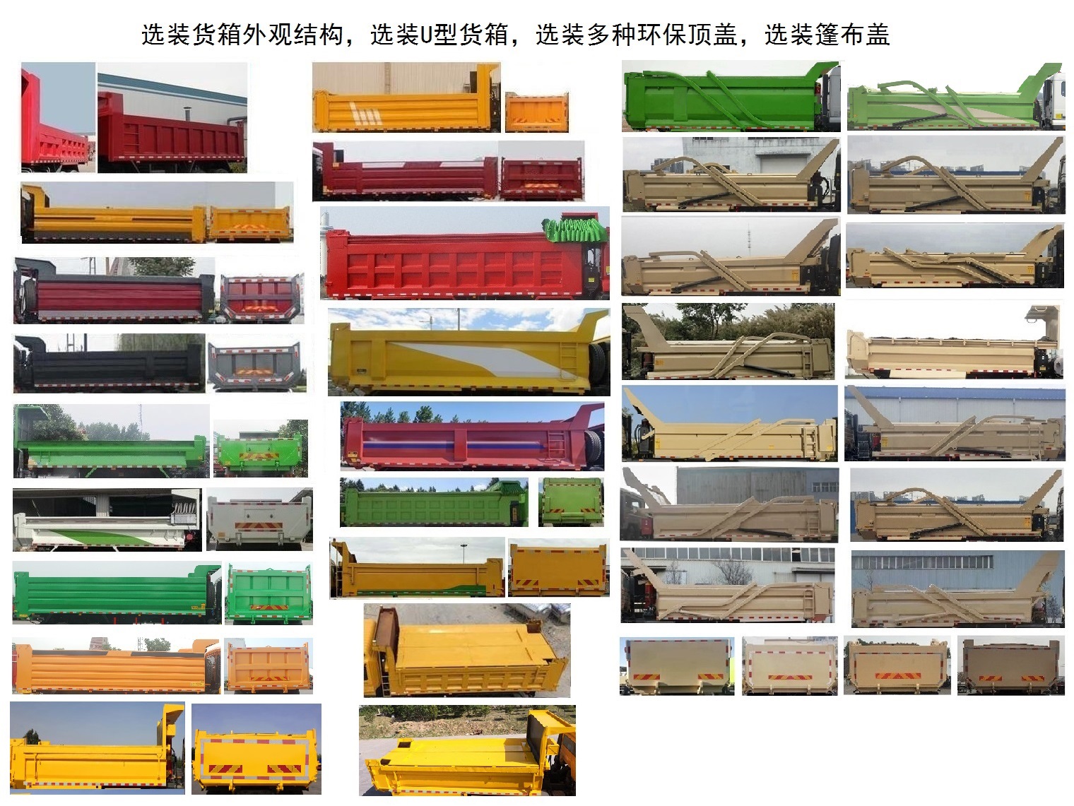 | 备注 | 该车选装普通驾驶室时,整车高度为2800mm或3550mm;选装半高顶驾驶室时,整车高度为3550mm。选装改外观的新款驾驶室。选装昼间行驶灯。选装后视镜。货箱自卸方式为后卸。该车可选装不同的货箱结构。选装U型箱,U型箱侧裙板为选装件。选装多种环保顶盖结构(包括篷布盖)。货箱上前伸的帽檐可取消。选装MC07.34-52发动机时,消声器位于车架右侧,尿素箱位于车架左侧一二轴之间,电瓶箱位于车架上方。侧面防护装置所用材料材质:Q235A,连接方式为螺栓连接。后部防护装置所用材料材质:Q235A,连接方式为螺栓连接,断面尺寸为100×100mm,离地高度为530mm。ABS系统型号为446 004 6300,ABS生产企业为威伯科汽车控制系统(中国)有限公司。该车选装MC07.31-50、MC07.34-50发动机的油耗申报值为46.0L/100km;选装MC07.34-52发动机的油耗申报值为44.0L/100km。安装具有卫星定位功能的行驶记录仪。该车可选装油浴式空滤器。该车可选装右置消声器。 | ||