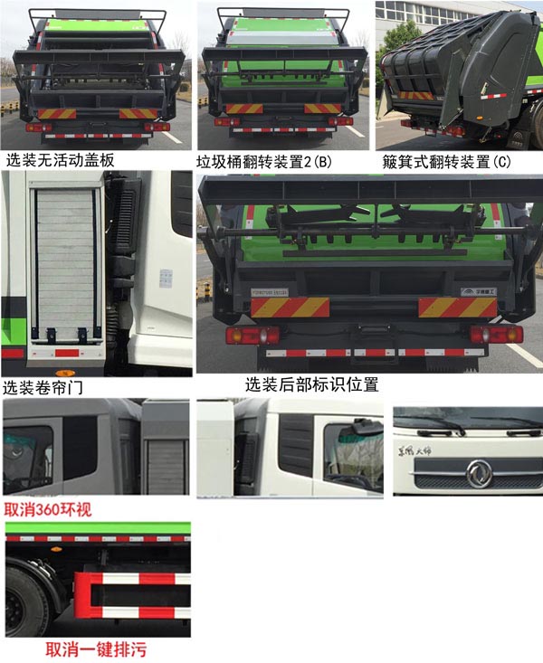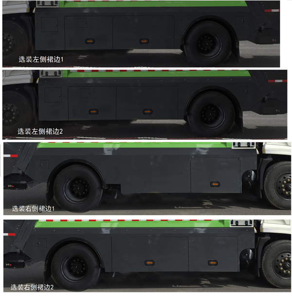 | 备注 | 1、该车有三种配置,分别为垃圾桶翻转装置1(基本型)(A),垃圾桶翻转装置2(B),簸箕式翻转装置(C);2、配置A、B时,车长8830mm,后悬2470mm,后伸430mm,整备质量10000kg,额定载质量为7805kg;配置C时,车长8630mm,后悬2390mm,后伸310mm,整备质量10200kg,额定载质量为7605kg;3、仅选用4500mm轴距;4、侧防护装置材料为Q345B,与车辆采用螺栓连接;可选装裙边结构,侧防护装置有车身裙边结构代替,故豁免;后防护装置与专用装置干涉,故豁免,专用装置离地高度为480mm;5、可选装不同裙边结构,可取消360环视,可取消一键排污,可选装箱体两侧卷帘门,选装后部标识位置和填装器无活动盖板状态,选装引起的质量参数变化在误差范围之内,可忽略不计;6、可随底盘选装驾驶室前脸造型;7、ABS型号:3631010-C2000,4460046440;生产厂家:东科克诺尔商用车制动系统(十堰)有限公司,威伯科汽车控制系统(中国)有限公司;8、发动机型号/油耗值(L/100km):ISD270 50/29,ISD210 50/29,ISD180 50/29,EQH180-53/29.2,ISB180 50/29.1,ISB210 50/29.1;9、该车装有箱体、填装器、后上料装置,用以收集、压实、转运垃圾作业;10、该车安装具有卫星定位功能的行驶记录仪。 | ||