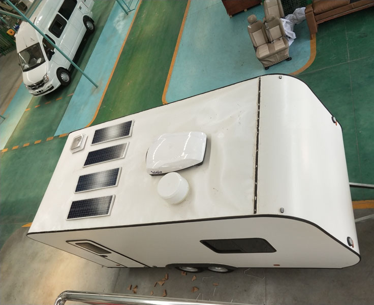 | 备注 | 1,车厢顶部封闭不可开启;2,车身为裙边厢结构代替防护装置,离地高420mm;3,牵引杆深入量45mm;4,车顶选装换气扇、太阳能板、遮阳蓬、卫星天线及车顶空调,选装遮阳蓬宽度为2450mm,选装卫星天线高度为2990mm,,选装车顶空调高度为3010mm;5,标准配置质量为1850KG,选装顶置空调、卫星天线、太阳能电池板的高配质量为2100KG;6,该车为非乘用车,行驶状态中不载人;7,内部安装柜子、桌椅、睡具、炊事设施、储藏等日常生活设备。 | ||