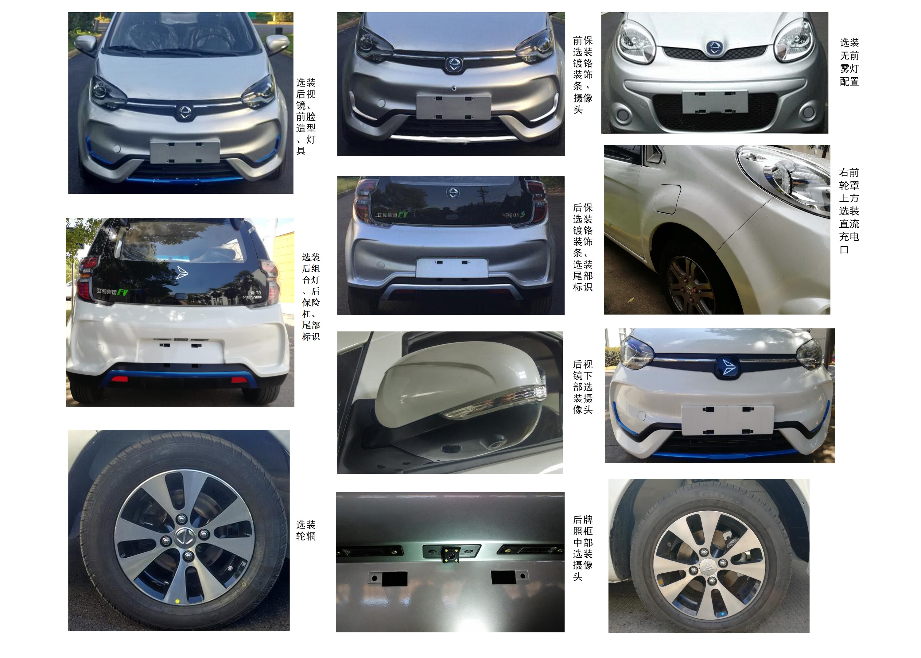 | 备注 | 该产品为新能源车辆,新能源类型为纯电动,1.储能装置种类:三元锂离子动力电池,生产企业:郑州比克电池有限公司;2.驱动电机额定功率:15kW,峰值功率:30kW;3.ABS型号/生产企业:DBC7.8/京西重工(上海)有限公司;4.右前轮翼子板处选装直流充电插座、选装外后视镜、轮辋、前后围不同造型、前后组合灯具、外后视镜下部/前后牌照板上方中部选装摄像头,选装不带前雾灯配置,选装前后围不同造型时车长为3650mm,前/后悬为740/565mm,接近角/离去角为18/30,车身两侧粘贴或喷涂装饰彩条。 | ||