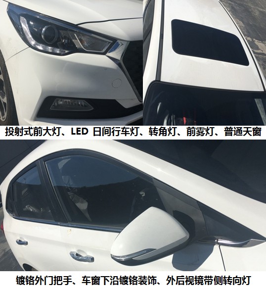 | 备注 | 选装:镀铬外门把手、车窗下沿镀铬装饰、投射式前大灯、LED 日间行车灯、转角灯、前雾灯、普通天窗、多轮毂式样、外后视镜带侧转向灯、前后盘式制动、后摄像头、后雷达、ABS控制器型号:MEB4,生产企业:无锡摩比斯汽车零部件有限公司(MOBIS)。净功率为73.3kW。 | ||