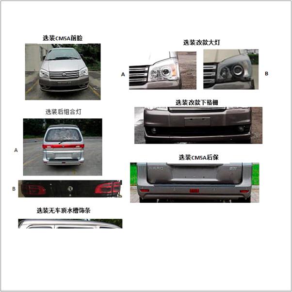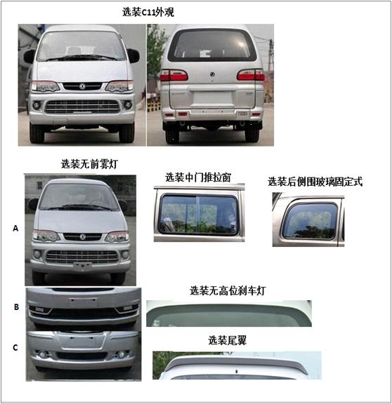 备注 | 选装C11外观, 选装后雨刷、后窗加热线,选装无高位刹车灯,选装轮毂,选装无前雾灯,选装CM5A前脸,选装改款大灯,选装改款下格栅,选装CM5A后保,选装尾翼,选装尾灯装饰板,选装无倒车雷达,选装倒车影像,选装尾门牌照装饰板,选装后组合灯,选装无车顶水槽饰条,选装五天窗,全车选装绿色玻璃,选装后侧围玻璃固定式,选装中门推拉窗、选装轮眉、D柱盖板。ABS型号/企业:ABS B/博世汽车部件(苏州)有限公司或 ABS D/京西重工(上海)有限公司。发动机最大净功率(kW):79。(可选)装限速装置,限速100km/h |