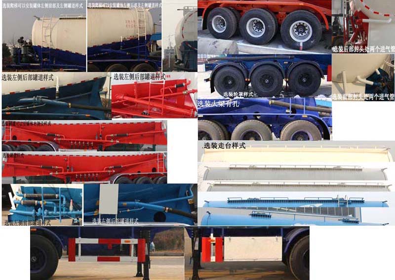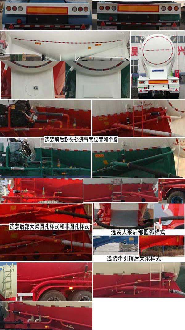 | 备注 | 罐体有效容积为:28.3立方米,运输介质:固井专用水泥,介质堆密度:1200千克/立方米,罐体尺寸(不含封头)长:8350mm,最大宽度:2495mm;选装车辆前部不加装机组,不带机组时外形尺寸为(mm):9250×2500×3990,选装爬梯的安装个数和位置及轮罩样式,罐体外形样式,空气悬挂,选装灯具型号及后组合灯所在部件的样式;车长为10000mm时,轴距为;5150+1310+1310,5000+1310+1310,前悬/后悬:-/880;车长为9250mm时,轴距为;5150+1310+1310,5000+1310+1310,前悬/后悬:-/880;ABS系统生产厂家:威伯科汽车控制系统(中国)有限公司,广州瑞立科密汽车电子股份有限公司,梁山顺安达汽车科技有限公司,型号:4005000810 4S2M,CM2XL-4S/2K(4S/2M),SAD-ABS4S/2M;侧面及后下部防护装置所用材料材质为:Q235,侧防护连接方式为:螺栓连接,后防护连接方式为:焊接或螺栓连接,后部防护装置的主要尺寸参数:断面尺寸(mm)为120×68,离地高度为:500mm. 后部不可开启,顶部封闭不可开槽. 选装大梁后部可以为弧形,选装爬梯的安装位置可以在罐体左侧前部或后部或罐体后部,爬梯个数可以为一个或两个或三个,选装轮罩样式及铝合金轮毂,选装走台样式,选装罐顶升降护栏,顶部可为挡水槽式也可为走台式,选装前后封头处进气管位置和个数,工具箱位置可选装,选装罐盖个数及位置,选装大梁可以钻孔,选装罐体罐道的样式. | ||
