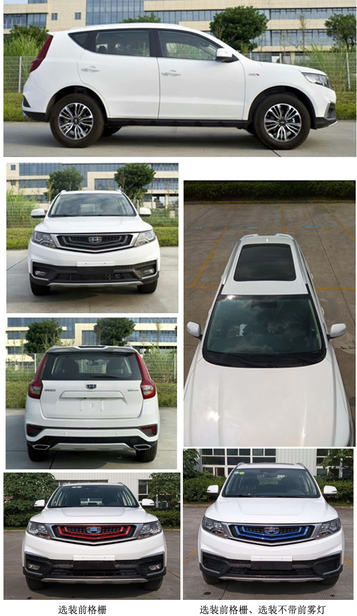 | 备注 | 选装不带行李架,不带天窗,不带后雨刮,不带前雾灯,轮辋,轮毂装饰罩,标识,后保装饰罩,车身贴花,全景天窗,鲨鱼鳍天线,下门槛,前保装饰罩,侧气囊,侧气帘.ABS系统的型号是ABS9,ESC9,GEELY ABS,ESP ,生产厂家均为博世汽车部件(成都)有限公司.该车型发动机最大净功率为98kW. | ||