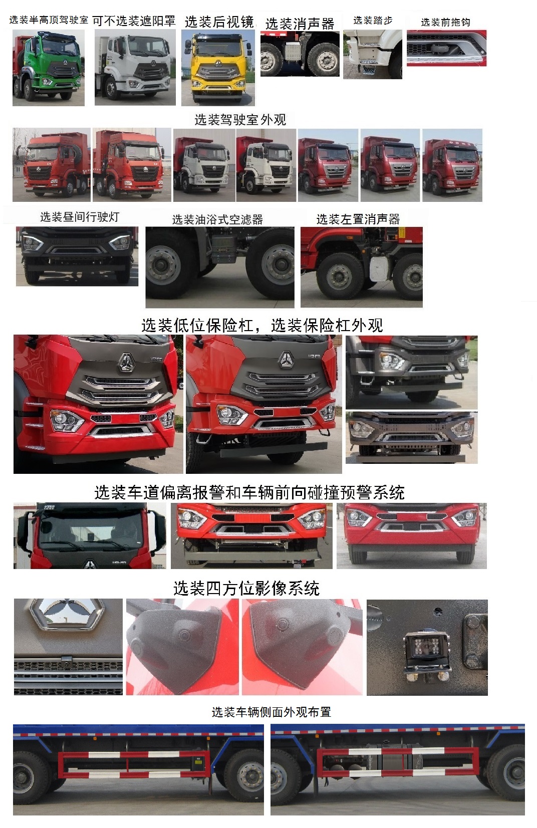 | 备注 | 该车选装普通驾驶室时,整车高度为2800mm或3550mm;选装半高顶驾驶室时,整车高度为3550mm;选装高顶驾驶室时,整车高度为3700mm。选装驾驶室面罩。选装后视镜。车长与轴距、后悬、货箱内长尺寸、离去角对应关系如下:10410/1800+3800+1350/1910/7600或7200/21°,10410/1800+3775+1400/1885/7600或7200/21°,10610/1800+3800+1350/2110/7800/20°,10610/1800+3775+1400/2085/7800/20°。货箱自卸方式为后卸。该车可选装不同的货箱结构。选装U型箱,U型箱侧裙板为选装件。选装多种环保顶盖结构(包括篷布盖)。货箱上前伸的帽檐可取消。该车选装D10.31-50、D10.34-50、D10.38-50发动机的油耗申报值均为46.0L/100km。侧面防护装置所用材料材质:Q235A,连接方式为螺栓连接。后部防护装置所用材料材质:Q235A,连接方式为螺栓连接,断面尺寸为100×100mm,离地高度为530mm。ABS系统型号为446 004 6300,ABS生产企业为威伯科汽车控制系统(中国)有限公司。安装具有卫星定位功能的行驶记录仪。 | ||
