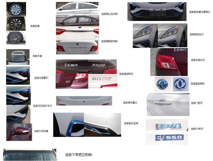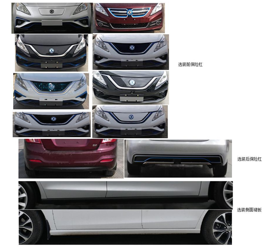 | 备注 | 动力蓄电池种类:锂离子动力蓄电池;动力蓄电池生产企业:欣旺达电动汽车电池有限公司;允许外接充电; ABS型号:ESP B,生产企业:博世汽车部件(苏州)有限公司;电动机额定功率40 kW,峰值功率90kW; 选装轮毂、选装天窗、选装无前雾灯、选装无日间行车灯、选装外后视镜、选装不带感应雨刷、选装侧立柱饰条、选装牌照装饰板、选装尾部标识、选装倒车雷达、选装盲区监测、选装前格栅无摄像头、选装前组合灯、选装后组合灯、选装蓝底商标、选装门把手、选装EV标识、选装前保险杠、选装后保险杠、选装侧面裙板 | ||
