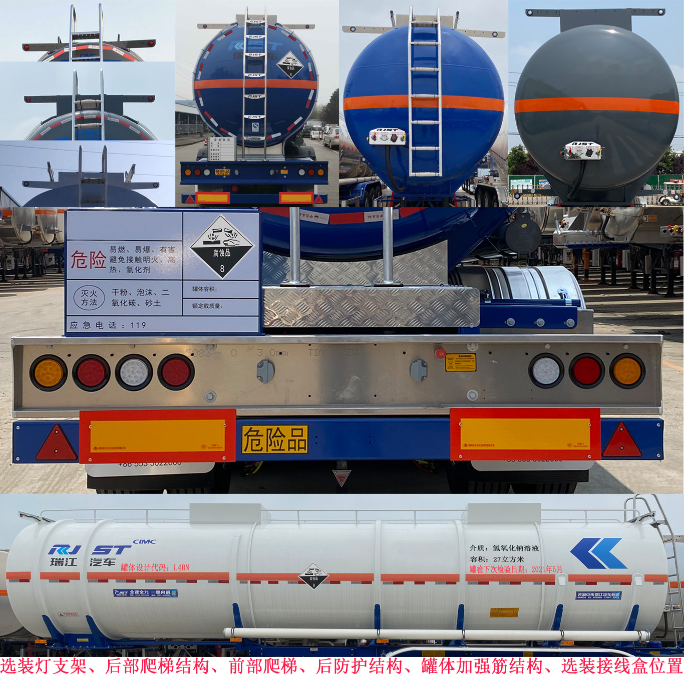 | 备注 | 罐体有效容积为27立方米,罐体外形尺寸:罐长9896mm,外径φ1910mm,运输车辆类型:AT,类项号:8.选装顶部结构,空气悬架,挡泥板,灯支架,多种胶管箱,选装前部爬梯.ABS生产厂为威伯科汽车控制系统(中国)有限公司,型号为4005000810;克诺尔商用车系统企业管理(上海)有限公司,型号为K068353XXX,EBS生产厂为克诺尔商用车系统企业管理(上海)有限公司,型号为K11061XVXX,ABS生产厂为广州瑞立科密汽车电子股份有限公司,型号为 CM2XL-4S/2M.侧、后防护材质均为为铝合金,连接方式均为螺栓连接式,后防护离地高度为500mm,后部防护装置的断面尺寸(mm):150×60.牵引车采用适用于牵引危险品运输半挂车的牵引车. | ||