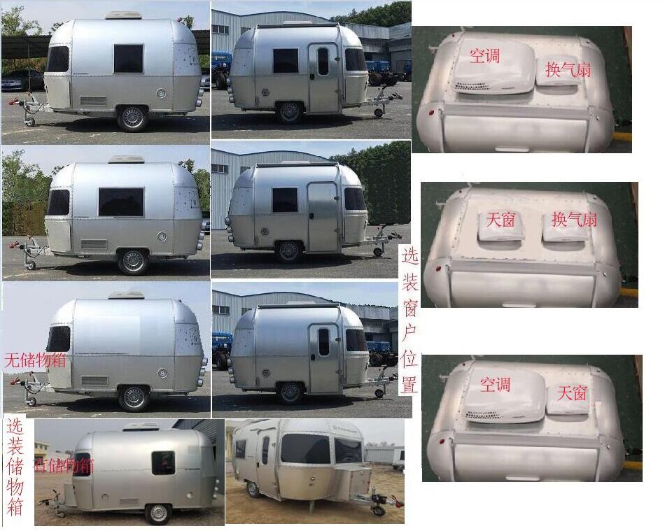| 备注 | 1.顶部封闭,不可开启;2.根据内部布置选装开窗位置大小,顶部选装有天窗,空调,换气扇;3.选装储物箱;4.牵引杆深入量为60mm,连接器最大负荷90kg;5.该车非乘用车,行驶过程中不载人;6.厢体内安装有床铺,桌柜,卫生设施等旅居专用设备. | ||