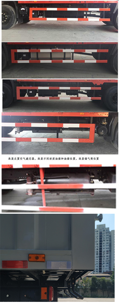 备注 | 随底盘选装排半驾驶室;选装厚顶驾驶室;随底盘选装前面罩,前保险杠及前部灯具,选装新后视镜;选装后部灯具.驾驶室前围选装扰流板;驾驶室卧铺侧窗选装装饰板;驾驶室顶部选装导流罩;选装前雾灯;选装前面罩;驾驶室顶部装饰灯为选装件.侧防护:材质Q235,螺栓连接;后下防护:材质Q235,螺栓连接,断面尺寸100X50mm或120X60mm,离地高度540;厢体顶部封闭,不可开启,侧面选装开门和不开门,厢体选装平板和瓦楞板结构.选装液压尾板,尾板收起状态时的水平长度为295mm.安装具有卫星定位系统的行驶记录仪.装有ABS,ABS型号及生产厂家:3631010-C2000/东科克诺尔商用车制动系统(十堰)有限公司,ABS 8/东科克诺尔商用车制动系统(十堰)有限公司,J ABS/焦作博瑞克控制技术有限公司.随底盘选装排气管前置,选装盘式制动器,选装限速装置,限速80km/h或89km/h. |