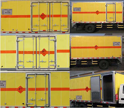 | 备注 | 厢体顶部封闭,不可开启,该车选装隔断,选装不同形式的单开侧门或双开侧门.危险货物运输车种类:EX/Ⅲ;运送具有独立容器包装的爆炸品品名:黑火药,压缩黑火药,电引爆雷管,爆破炸药,聚能装药.运输介质类别和项别号:1.1D,1.1D,1.1B,1.1D,1.1D;侧面,后面防护装置的横杆材料为Q235,侧、后防护为螺栓连接,后防护断面尺寸100×50mm,后防护离地高度为400mm; ABS系统型号:APG3550500A,ABS系统生产厂家:浙江亚太机电股份有限公司。仅选用发动机JX493ZLQ5最大净功率为83kw对应油耗值13.0L/100km;该车安装有盘式制动器,限速装置,限速80km/h,消声器前置。该车仅使用子午线轮胎。该车安装具有卫星定位功能的行驶记录仪。 | ||