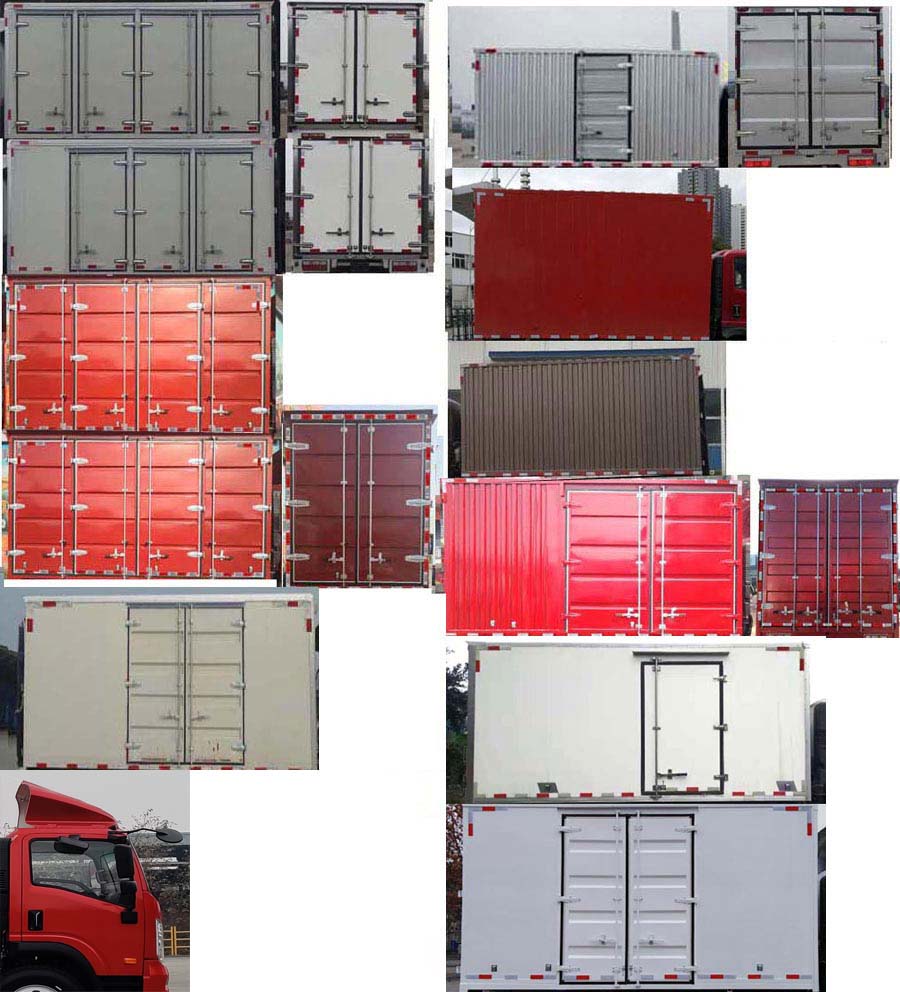 | 备注 | 选装前面罩及液压尾板,尾板收起状态的水平长度为200mm;选装新款前部灯具、前面罩、保险杠及后视镜;装单排驾驶室货箱长3670mm,装排半驾驶室货箱长3370mm;仅选用底盘2900mm轴距;顶部封闭,不能开启;ABS型号为:CM4XL-4S/4K(4S/4M)和VIE ABS-II, 生产厂家为:广州瑞立科密汽车电子股份有限公司和浙江万安科技股份有限公司;防护栏均采用Q235钢板压制成型,均采用螺栓连接方式;后防装置下边缘的最大离地高度为460mm,断面尺寸为120mm×50mm;发动机4DW93-84E5油耗12.4,发动机D19TCIE1油耗12.6,YN27CRE1油耗12.5 | ||